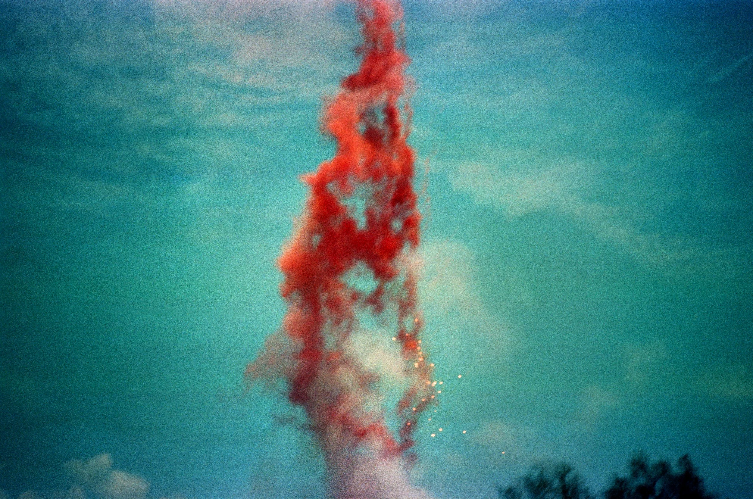 Lucky Rocket brings together these two moments — 2014 in black and white, 2024 in colour — into a spontaneous, saturated reflection on ritual, return and release.